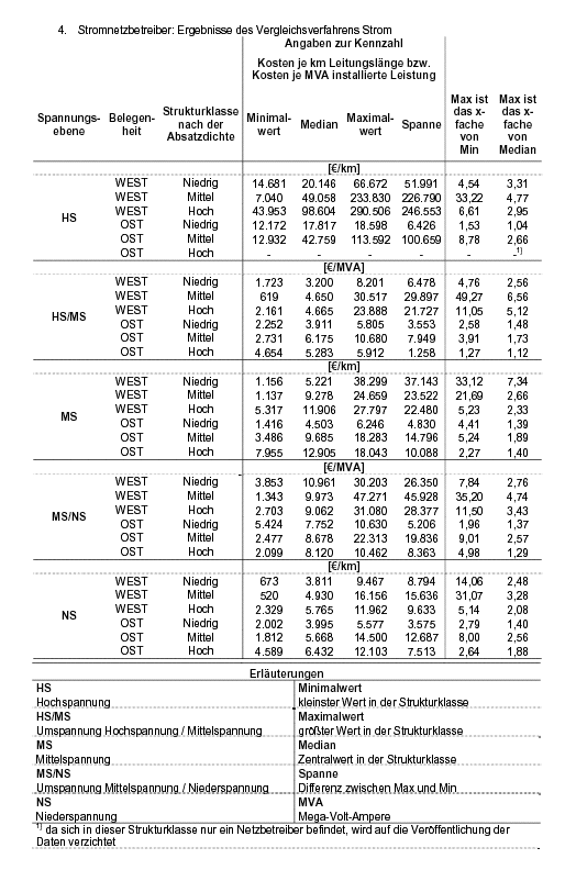 Die von den deutschen Netzbetreibern veranschlagten Netzkosten - nach denen sich die Netznutzungsentgelte richten - weisen auch innerhalb vergleichbarer Strukturklassen riesige Unterschiede auf. Die teuersten Stromnetzbetreiber machen bis zu fünfzigmal so hohe Kosten geltend wie die billigsten, und auch von den Mittelwerten entfernen sie sich um bis zu mehr als das Siebenfache. Dies ergibt sich aus den Ergebnissen der Vergleichsverfahren Strom und Gas, die die Bundesnetzagentur am 24. August im Internet veröffentlichte (siehe Tabelle 1).