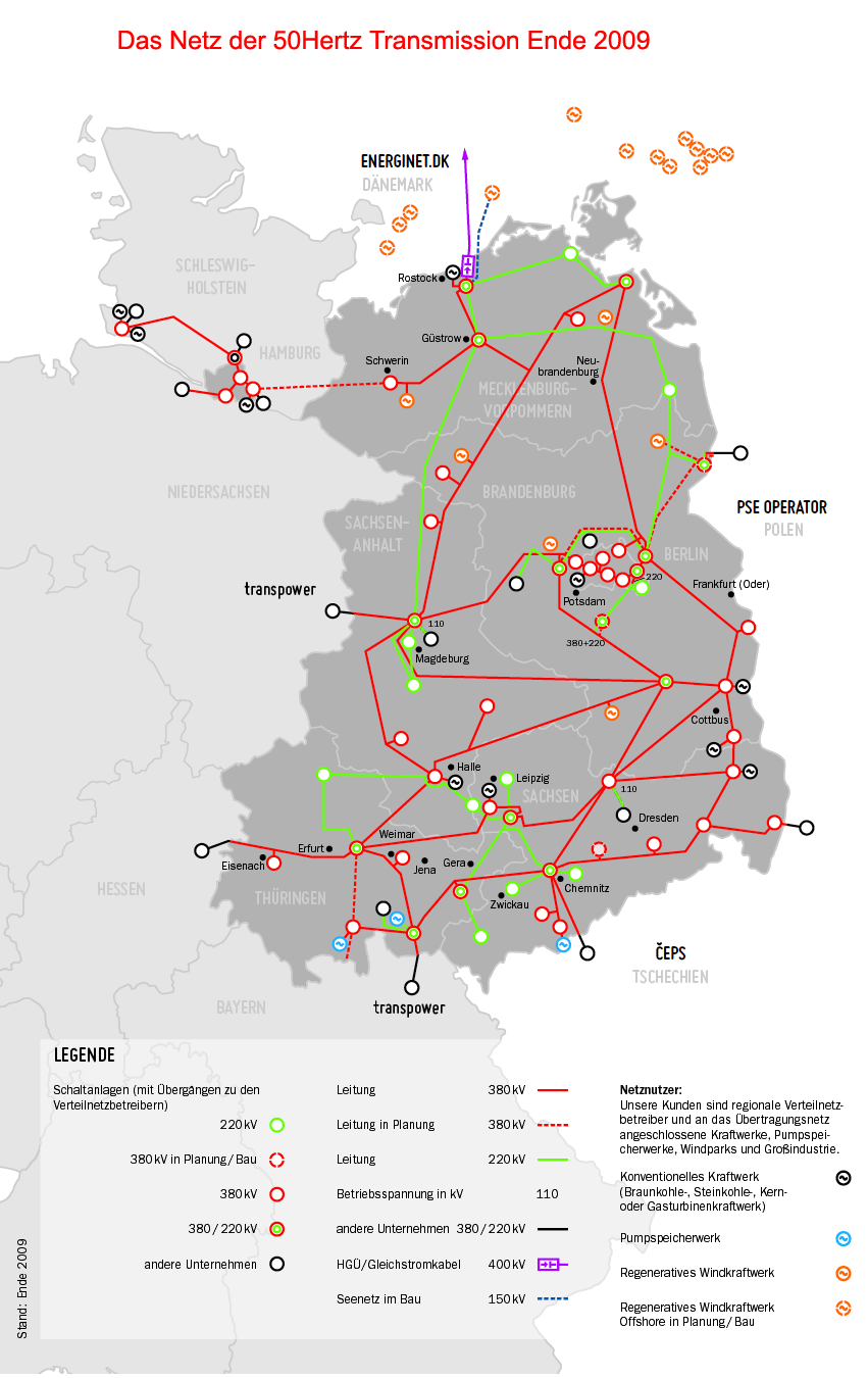 Der Vattenfall-Konzern wird sein deutsches Stromtransportnetz für 810 Millionen Euro an den belgischen Netzbetreiber Elia und einen Finanzinvestor verkaufen. Das sind 310 Millionen mehr, als der Vertrag mit Deutscher Bank, Allianz und Goldman Sachs vorsah, zu dessen Unterzeichnung es Ende 2009 fast gekommen wäre. Vattenfall war von dem Verkauf zurückgetreten, nachdem bekannt wurde, daß E.ON für sein nicht viel größeres Transportnetz rund eine Milliarde Euro erzielte (091101). Einen Verkauf unter Wert wollte sich der bereits angeschlagene schwedische Konzernchef Lars Josefsson kurz vor seinem Abtritt nicht auch noch vorwerfen lassen (091113).