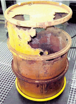 Das seit fünf Jahren stillstehende Kernkraftwerk Brunsbüttel (101202) sorgt auch nach der endgültigen Abschaltung (110302) noch für Schlagzeilen: Im Keller des sogenannten Feststofflagers, in dem Stahlblechfässer mit schwach- und mittelradioaktiven Abfällen lagern, wurden jetzt bei etlichen Fässern Korrosionserscheinungen festgestellt. Ein Faß war sogar so durchgerostet, daß es auseinanderbrach (siehe Foto). Zum Glück passierte das erst, nachdem der Inhalt bereits in einen "Gußcontainer" umgefüllt worden war, mit dem der Abfall später einmal in das Endlager "Schacht Konrad" (100908) verbracht werden soll. Der KKW-Betreiber Vattenfall verschwieg den Vorfall. Seiner Ansicht nach handelte es sich nicht um ein meldepflichtiges Ereignis. Das schleswig-holsteinische Justizministerium als zuständige Atomaufsicht erfuhr erst nachträglich und eher zufällig davon. Über eine Pressemitteilung des Ministeriums vom 7. März gelangte die Sache schließlich an die Öffentlichkeit.