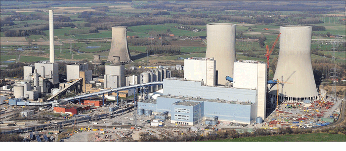 Links im Bild sieht man die drei alten Blöcke A, B und C des Kraftwerks Westfalen. Sie sind inzwischen alle abgeschaltet. Der neue Block D des GEKKO-Projekts wird erst gar nicht ans Netz gehen, weil er bei den Bauarbeiten beschädigt wurde und seine Sanierung mehr Kosten verursachen würde als eine Totalabschreibung.