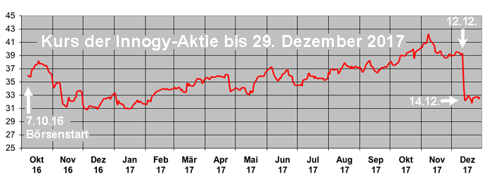 Auf die Gewinnwarnung vom 13. Dezember reagierte die Börse ungewöhnlich heftig: Binnen zwei Tagen stürzte die Innogy-Aktie von zuletzt 39,36 Euro auf 32,20 Euro. Dann blieb sie vorerst auf diesem Niveau. Daran änderte auch Teriums Entlassung am 19. Dezember nichts. |