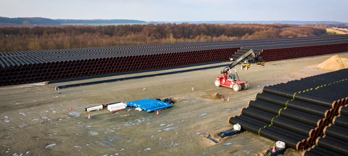 Bei Mukran auf Rügen lagern schon seit 2017 rund 45.000 Rohre für die beiden neuen Stränge der Ostsee-Pipeline, die von hier aus verlegt werden sollen. Weitere solcher Rohrlager gibt es in den finnischen Häfen Hanko und Kotka sowie im schwedischen Hafen Karlshamn. Vor der Verlegung werden die Rohre mit Beton ummantelt, damit sie im Wasser nicht auftreiben. Foto: Nord Stream 2 AG |