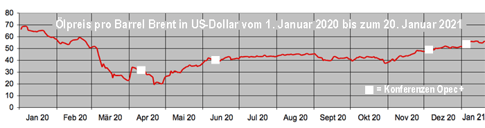 Am 10. April vorigen Jahres beschloss die Opec-Plus-Runde eine Verknappung der Ölförderung um täglich 9,7 Millionen Barrel. Bis die Förderbeschränkung ab Mai wirksam wurde, sank der Ölpreis noch weiter bis auf 20 Euro. Bis zur nächsten Konferenz am 6. Juni hatte er sich aber schon wieder verdoppelt. Er blieb dann auch auf diesem Niveau, obwohl die Verknappung von August bis Jahresende auf 7,7 Millionen Barrel verringert wurde. Ab 2021 war eine weitere Absenkung auf 5,8 Millionen Barrel geplant, wodurch der Preis vermutlich bei 50 Euro stabilisiert worden wäre. Auf den beiden jüngsten Konferenzen der Opec-Plus-Runde am 3. Dezember und 4. Januar entschied die Mehrheit aber anders und beschloss nur schwache Abstriche, damit der Ölpreis noch weiter anzieht. |