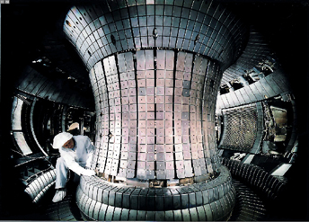 | Wie aus der Schrottpresse: So sieht der Torus des 2014 fertiggestellten "Stellarators" Wendelstein 7-X aus, in dem das Plasma von Magnetfeldern in der Schwebe gehalten wird. Die gequetschte Form ist das Ergebnis ausgefeilter Berechnungen zur Erzeugung eines besonders stabilen und wärmeisolierenden magnetischen Käfigs. | Schön symmetrisch: Beim konkurrierenden Prinzip des "Tokamak" ist die Bauweise einfacher. Ein großer Nachteil gegenüber dem "Stellarator" ist aber die Instabilität des Plasmas, die nur einen pulsierenden Betrieb ermöglicht. Das Foto zeigt den ASDEX Upgrade, den das Max-Planck-Institut für Plasmaphysik in Garching seit 1991 betreibt. |